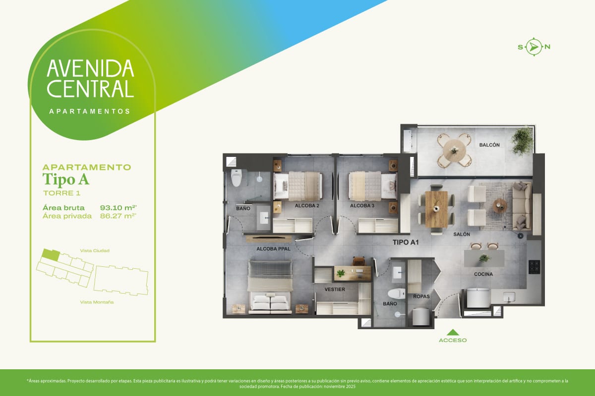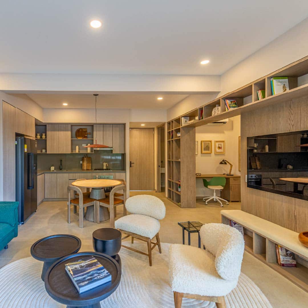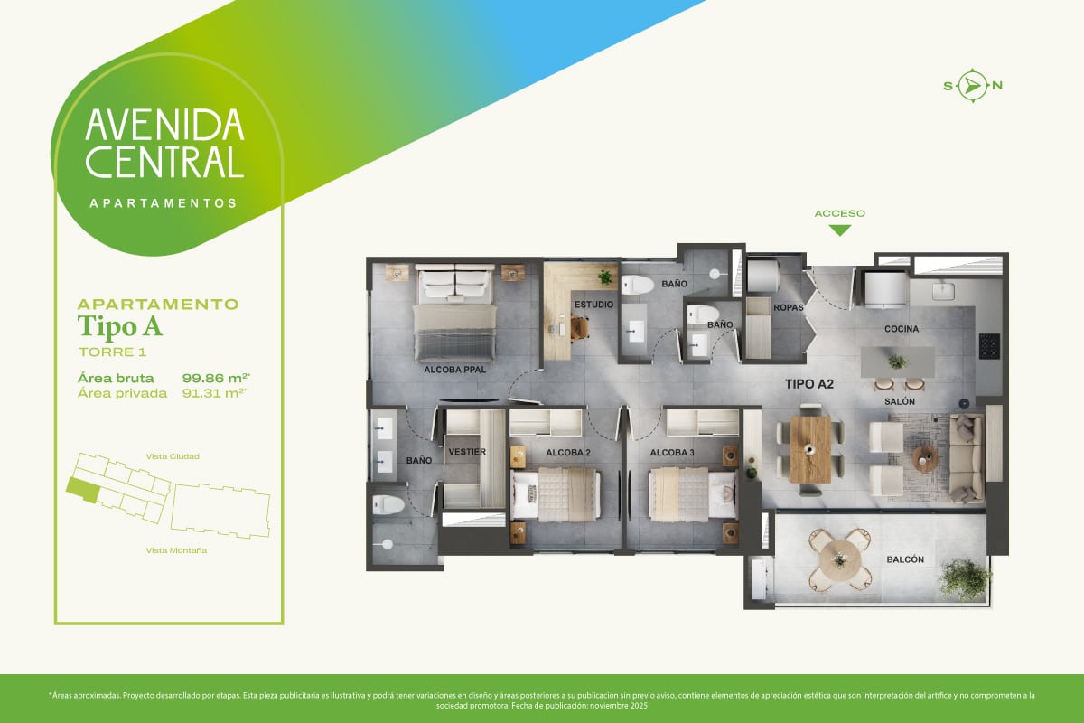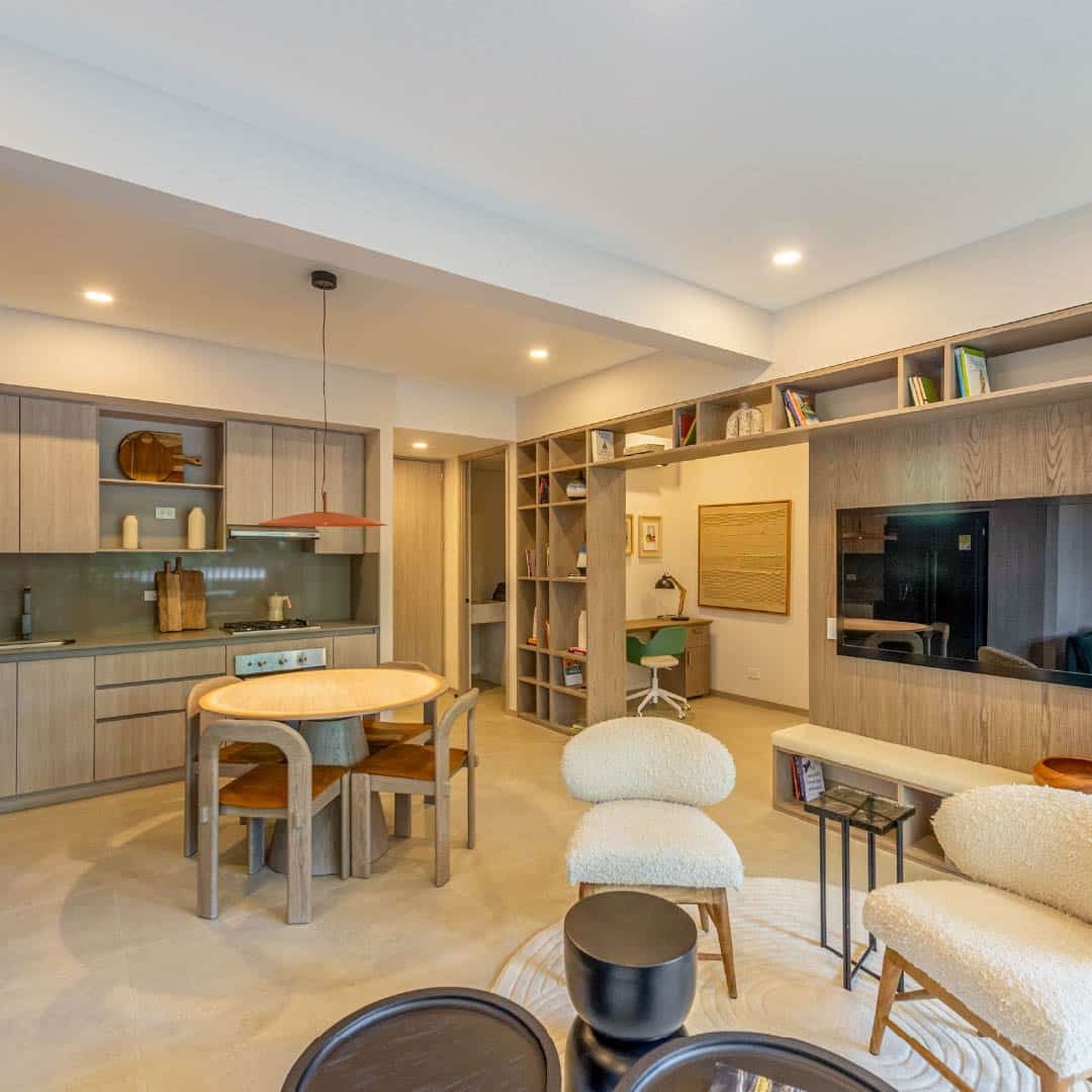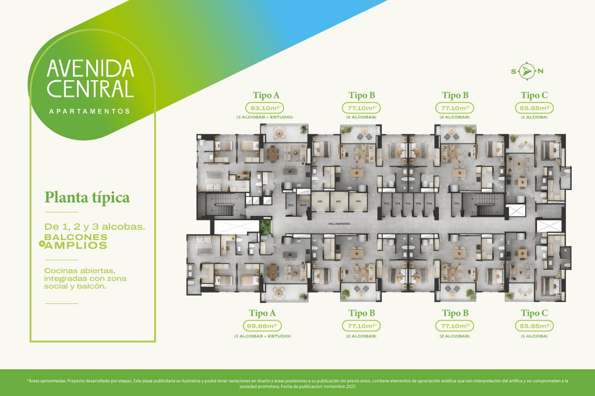 Apartamentos con áreas de 55 a 99 m2 de 1, 2 y 3 alcobas más estudio.